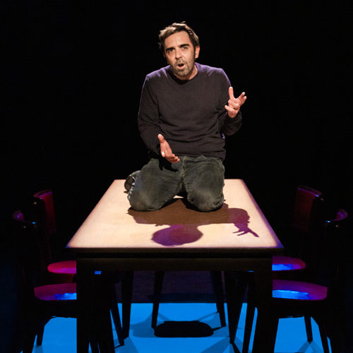 Il porte un complet sombre, veston impeccablement repassé. Il a beau faire les pieds au mur, se tordre en tous sens, tenir l’équilibre sur les mains, s’arc-bouter sur les cloisons, s’étirer de tout son long, vibrer ou s’électrifier au son live d’une guitare électrique, rien n’y fait : le cube dans lequel il évolue se referme peu à peu. L’espace se rétrécit inexorablement. La vision est prenante et elle convoque le pire de nos cauchemars. Celui d’un enfermement contre lequel nos poings, tambourinant sur les parois, s’avèrent impuissants. Dans ce spectacle saisissant à nul autre pareil, entre danse et performance circassienne, Pierre Rigal peint des tableaux oniriques. Individu-produit, dandy inquiétant, businessman moderne dans son immense banalité, il est mu par l’enchaînement standardisé de ses propres automatismes, mais aussi par les rouages d’une surface vitale de plus en plus restreinte. L’homme pétri de ses contradictions s’enlise dans une impasse, captif de quatre murs, espace mental oppressant, ou sublime projection. Il lutte contre les éléments et se fait le démiurge d’une scène où tout est à réinventer.